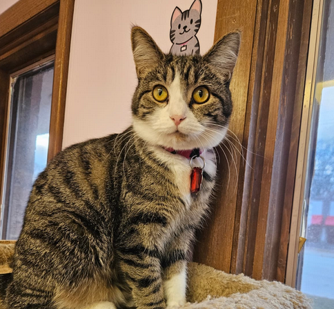Pitzel was abandoned against a house in a neighborhood. She was found by a kind lady. Pitzel, along with her sisters, Butterball and Sugar Cookie, were brought to our vet's office on June 7th, 2025. Her date of birth is April 10th, 2025. Pitzel is a happy kitty, loves to play and run around with her kitty sisters and friends. She was in a foster home for awhile until October and then they came back to the shelter in hopes of finding their furever home. Please come meet this tabby and white little beauty. Her adoption fee is $120.00.